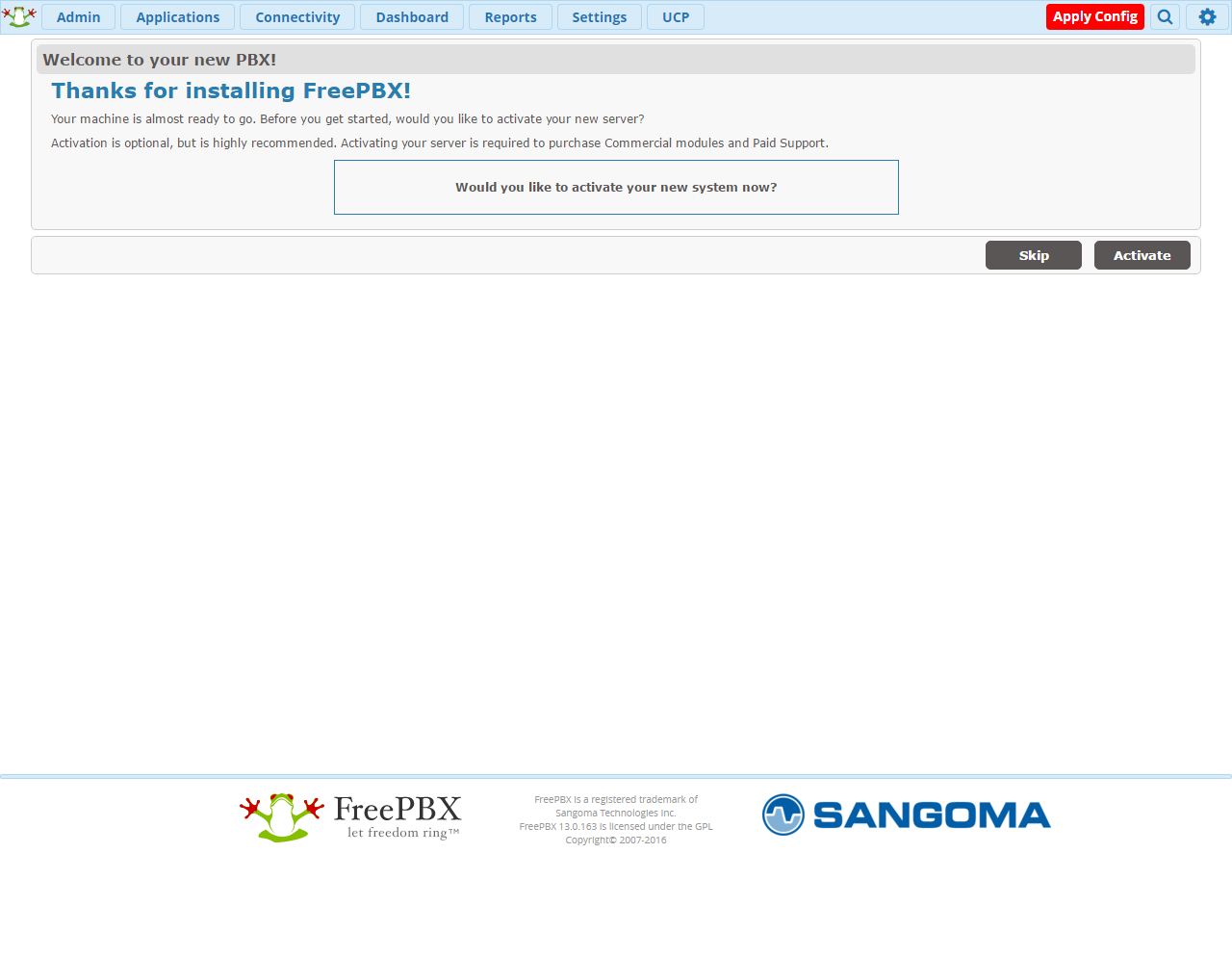 これを行うためには、上メニューのAdminから、Asterisk CLIに入り、core restart nowと入れ、SendCommandを押すと即座に再起動が開始する。